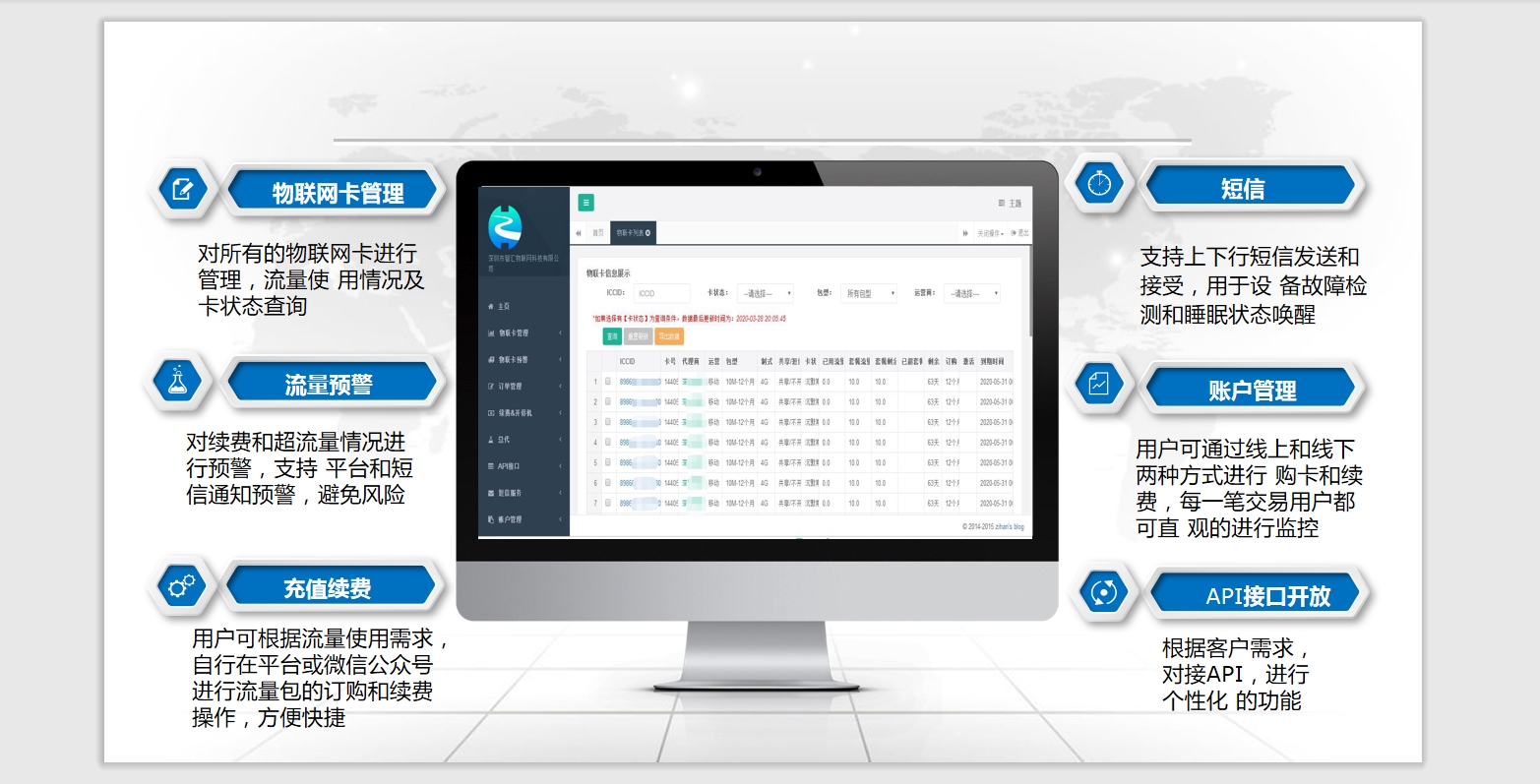 物联网卡管理平台,便捷简单的管理系统,提供联通物联网卡、电信物联网卡、移动物联网卡、物联网专用卡、物联网流量卡充值、流量查询,生命周期、业务状态、套餐,资费财务缴费管理和业务预警处理等平台增值功能。